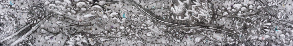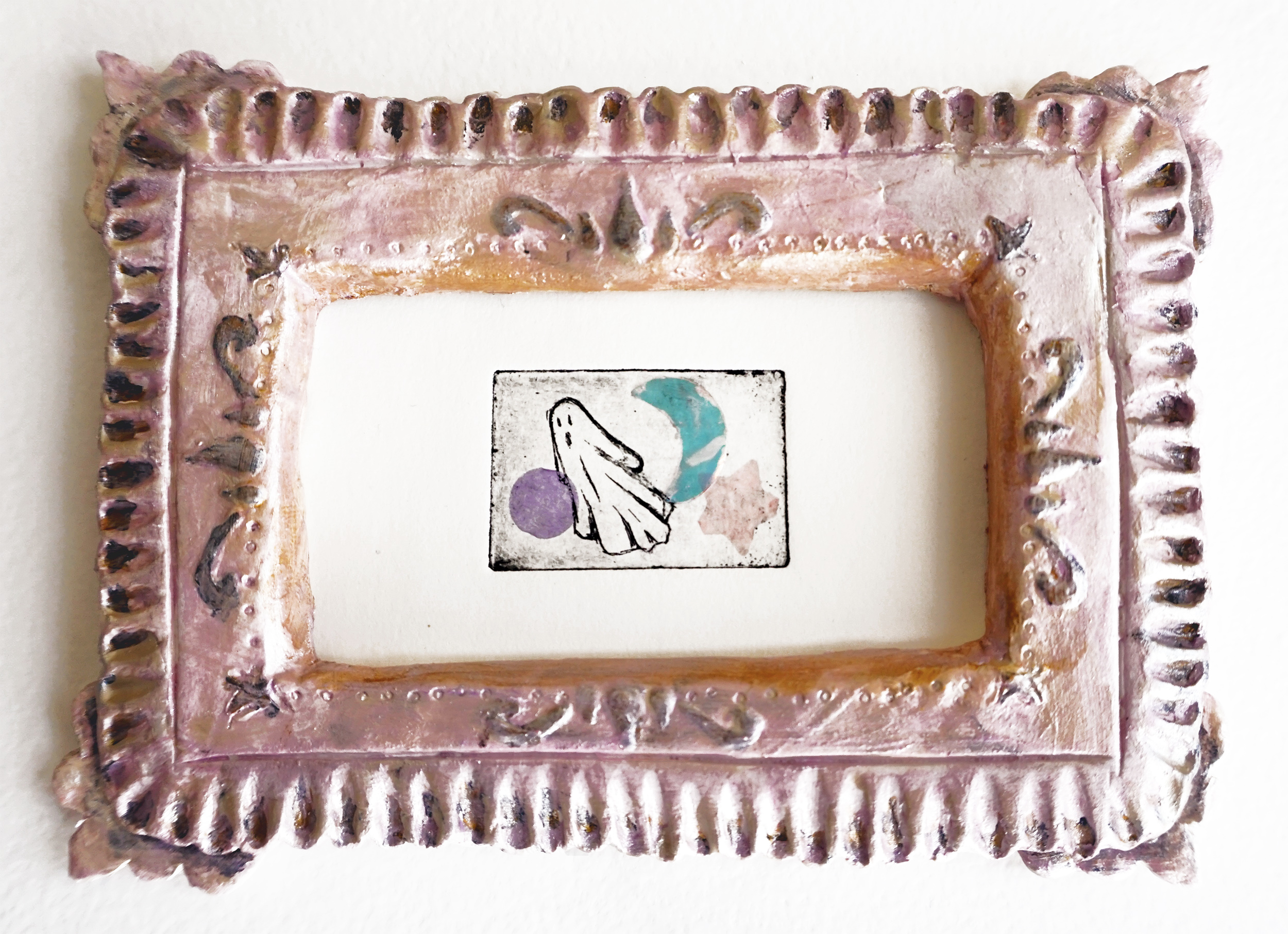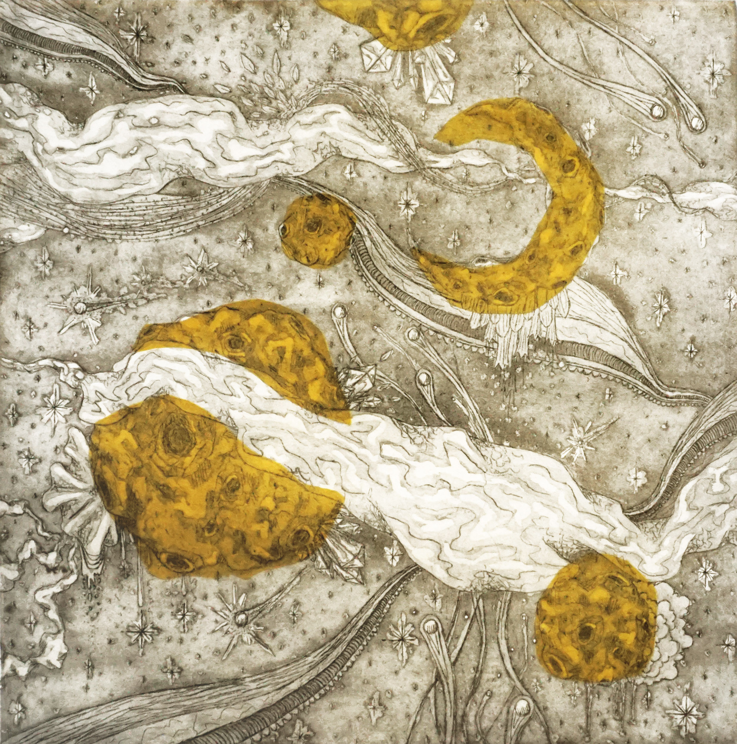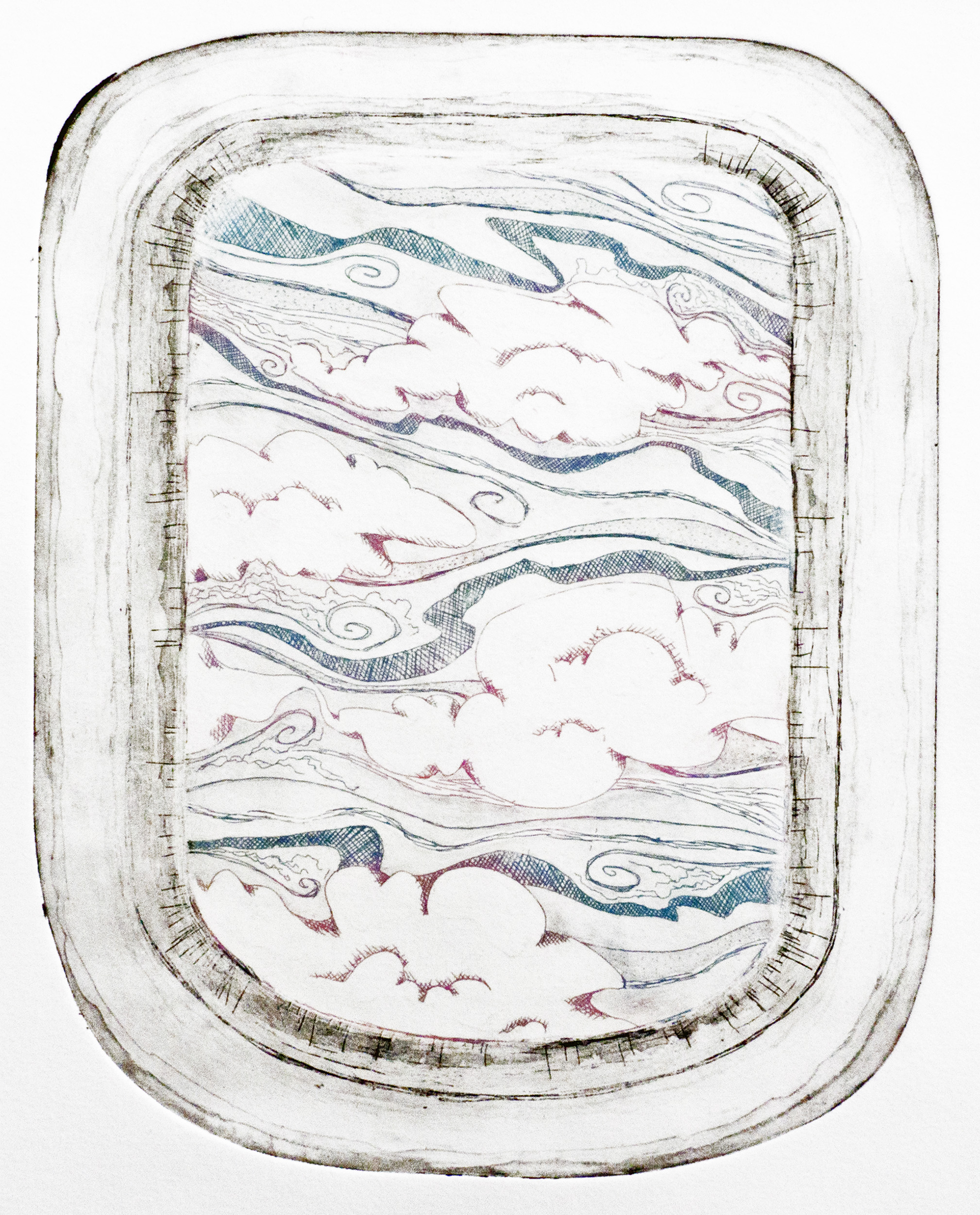 My goal is to create an ethereal landscape in which we may exist when we are disconnected from our physical selves. Many struggle with mental and neurological health issues that create a gap between the mind and body. This can happen in shorter moments like sleepwalking or seizures, or it can become your new life, as with Alzheimer’s Disease. I experiment with chine colle and intaglio, using confetti, tissue paper, and glitter to adhere to prints. Hand-built porcelain frames are also included in this series. I hope viewers find comfort and familiarity in the haunting figures, as most of us will be visiting this “gap” throughout our lives.